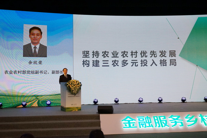 农业农村部定于2019年1月18日(周五)上午9时举行金融服务乡村振兴高峰论坛。重点围绕乡村振兴对金融需求的重点领域、亟待突破的制度和政策瓶颈、创新拓展投融资渠道与模式等问题进行交流探讨,明确方向,凝聚共识,创新理念,推动合作,有效引导金融和社会资本投入乡村振兴,加快推进各方对乡村振兴的投入落实落地,形成全社会积极参与的多元投入格局。图为农业农村部党组副书记、副部长余欣荣发表主旨演讲。农业农村部网站 李镆摄
