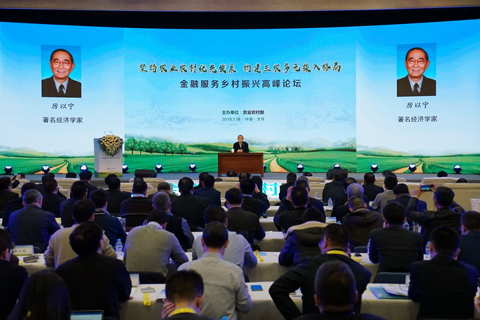 农业农村部定于2019年1月18日(周五)上午9时举行金融服务乡村振兴高峰论坛。重点围绕乡村振兴对金融需求的重点领域、亟待突破的制度和政策瓶颈、创新拓展投融资渠道与模式等问题进行交流探讨,明确方向,凝聚共识,创新理念,推动合作,有效引导金融和社会资本投入乡村振兴,加快推进各方对乡村振兴的投入落实落地,形成全社会积极参与的多元投入格局。图为著名经济学家、北京大学光华管理学院名誉院长厉以宁发表演讲。农业农村部网站 李镆摄