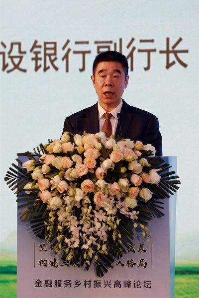 农业农村部定于2019年1月18日(周五)上午9时举行金融服务乡村振兴高峰论坛。重点围绕乡村振兴对金融需求的重点领域、亟待突破的制度和政策瓶颈、创新拓展投融资渠道与模式等问题进行交流探讨,明确方向,凝聚共识,创新理念,推动合作,有效引导金融和社会资本投入乡村振兴,加快推进各方对乡村振兴的投入落实落地,形成全社会积极参与的多元投入格局。图为中国建设银行副行长章更生演讲。农业农村部网站 李镆摄