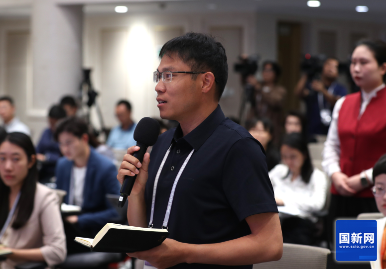 国务院新闻办公室于2025年9月16日(星期二)上午10时举行“高质量完成‘十四五’规划”系列主题新闻发布会,请农业农村部部长韩俊、农业农村部副部长张兴旺、农业农村部副部长麦尔丹·木盖提介绍“十四五”时期农业农村发展成就,并答记者问。图为农民日报记者提问。赵一帆 摄