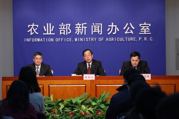 2012年2月14日,农业部新闻办公室举行新闻发布会,农业部新闻发言人、总经济师陈萌山和发展计划司司长钱克明向媒体介绍《全国现代农业发展规划》的有关情况,并回答记者提问。图为发布会进行中。