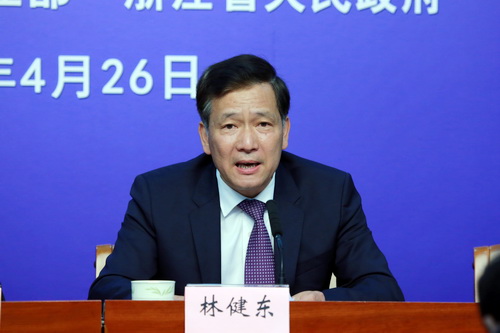 茶博会组委会秘书长、浙江省农业厅厅长林健东介绍首届茶博会筹备情况