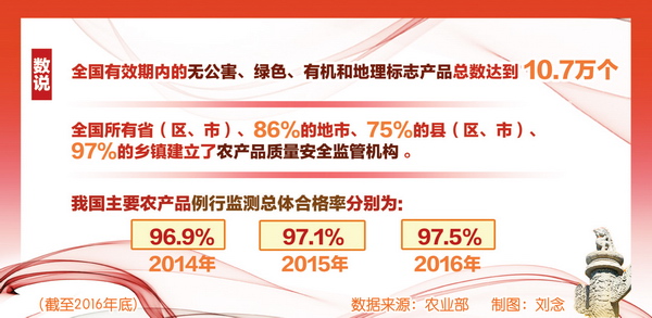 措施得力,保障有力,为我国农产品质量安全赢得了总体平稳、持续向好的局面。在连续多年未发生重大农产品质量安全事件的基础上,2014年、2015年、2016年,我国主要农产品例行监测总体合格率分别为96.9%、97.1%、97.5%。
