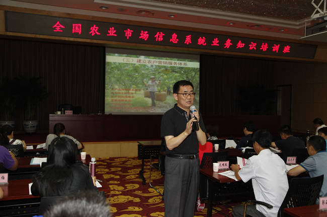 图为全国农业市场信息系统业务知识培训班第三期授课现场。市场与经济信息司司长张合成亲自授课。