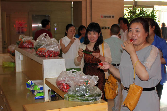 图为学员体验“O2O”模式购买的黄瓜和西红柿
