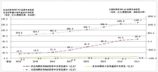 一是投入支持不到位。根据2003—2011年统计数据,中央投入全国科研机构的科学研究及技术研发(R&D)经费由320.3亿元增长到1106.1亿元,年均递增18.3%;中央投入农业科研机构R&D经费由12.8亿元增加到68.5亿元,年均递增25.9%,而中央投入农业科研机构能力条件建设资金,仅由3.2亿元增加至6.5亿元,年均递增速度只有7.1%。详见专栏一。从投资方向看,支持中央级农业科研单位的投资渠道较多,支持省属农业科研单位的投资渠道相对较少,而地市级农业科研单位投资严重不足。从投资学科看,良种繁育、动物防疫、植保工程等学科投入相对较多,而耕地保育、设施农业工程、生态环境等学科投入较少。