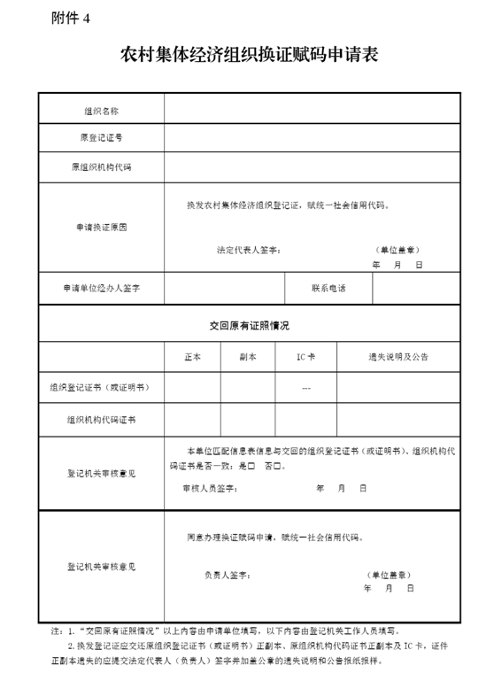 (二)按期完成农村集体经济组织的换证赋码。本通知下发前已经取得组织机构代码的农村集体经济组织,要根据《国家发展改革委办公厅关于在办理相关业务中使用统一社会信用代码的通知》要求,于2020年底前完成换证赋码工作。2015年以来在农村集体产权制度改革试点中,自行编码发证的农村集体经济组织,应于2019年6月30日前完成换证赋码工作。未按期完成换证赋码的农村集体经济组织,其旧证照作废。已取得组织机构代码的农村集体经济组织,在办理换证赋码时要由全体成员指定的代表或委托代理人,到登记赋码管理部门如实填报《农村集体经济组织换证赋码申请表》,提供原组织登记证书(或证明书)正本、副本,原组织机构代码证书正本、副本、IC卡,组织章程、法定代表人(负责人)身份证原件及复印件等材料。登记赋码管理部门要将相关信息与代码中心逐一核对无误后,换发《农村集体经济组织登记证》,统一收回原组织登记证书(或证明书)、组织机构代码证书及IC卡等。自行编码发证的农村集体经济组织,参照上述规定开展换证赋码工作。农村集体经济组织凭《农村集体经济组织换证赋码申请表》和《农村集体经济组织登记证》正本或副本,到相关部门办理银行账户变更等手续。