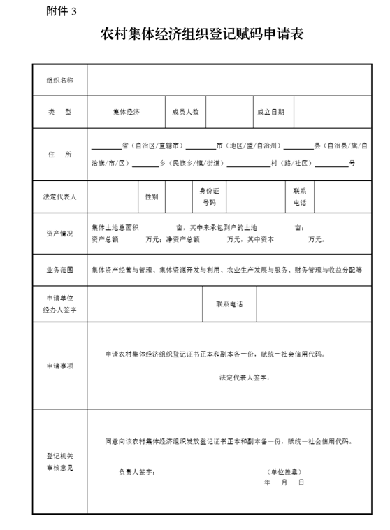 (一)积极开展农村集体经济组织的登记赋码。农村集体产权制度改革后成立的新型农村集体经济组织,要及时到登记赋码管理部门办理相关登记赋码手续。农村集体经济组织在办理登记赋码时,要由全体成员指定的代表或委托代理人,到登记赋码管理部门如实填报《农村集体经济组织登记赋码申请表》,提供经县或乡(镇)人民政府批准成立的文件,成员大会或经成员大会授权的成员代表会议决议、成员名册、组织章程、法定代表人的身份证原件及复印件、住所证明等材料。登记赋码管理部门要严格审核相关材料,对于符合登记赋码条件的,在受理之日起15个工作日内办理相关手续,颁发《农村集体经济组织登记证》;对于申请材料不完整的,应责成农村集体经济组织在15个工作日内补充完善;对于不符合登记赋码条件的,应当给予书面答复。