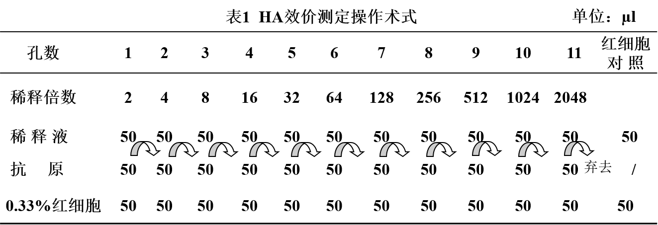 1.2 HA效价测定 取出鸭坦布苏病毒血凝抑制试验抗原样品,加入1ml BABS复原,待抗原完全溶解成澄明液体后,进行HA效价测定。采用96孔U型微量板进行试验,反应总体积为100µl。从第1孔至第12孔,用移液器每孔加入BABS 50μl,吸取被检样品50μl,从第1孔起,依次作2倍系列稀释,至第11孔,弃去移液器内50μl液体,第12孔为不加样的红细胞对照孔,然后每孔加入0.33%的鹅红细胞。立即在微量板振摇器上摇匀,放入湿盒,置37℃作用60分钟,观察凝集反应。具体操作方法见表1。结果判定:当对照孔中的红细胞呈显著纽扣状时判定结果。以使红细胞完全凝集的最高稀释度作为判定终点。