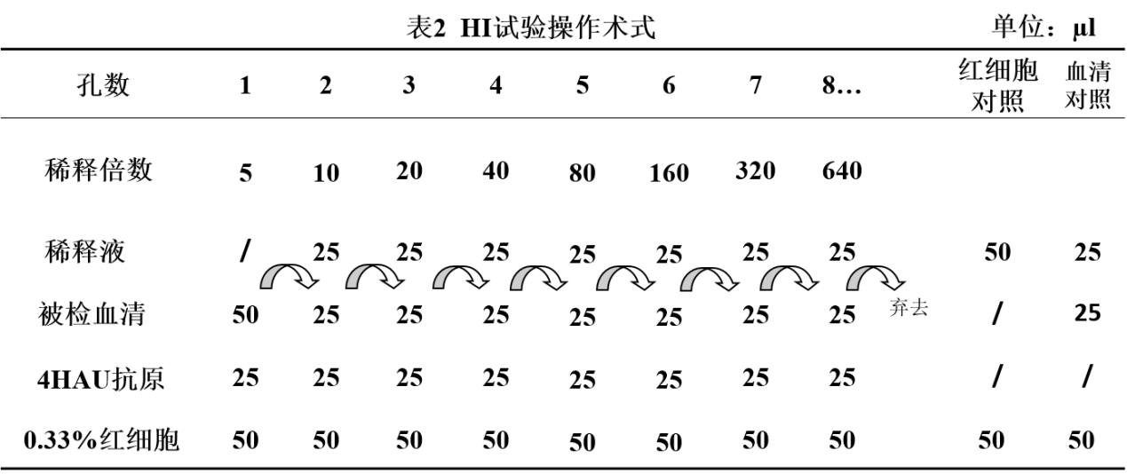 2.2 HI试验的操作方法 应用96孔U型微量板进行试验,反应总体积为100µl。按表2,用BABS将血清(待检血清前处理方法见附注3)作2倍系列稀释,加入25µl 4HAU工作抗原,充分振摇后,置于湿盒内2~8℃作用16~28小时。取出,室温放置30~60分钟后,加入0.33%的鹅红细胞,混匀,放入湿盒,置37℃作用60分钟,观察凝集反应。试验设阴、阳性血清对照、处理后的血清样品对照及红细胞对照。具体操作方法见表2。结果判定:以阳性对照血清出现明显的血凝抑制现象开始判定,当对照阴、阳性血清的HI抗体效价与已知效价相差不超过1个滴度时,试验结果成立。以使红细胞凝集被完全抑制的血清最高稀释度作为判定终点。待检血清的HI抗体效价低于1∶10判为阴性,HI抗体效价等于1∶10判为可疑,HI抗体效价不低于1∶ 20判为阳性。