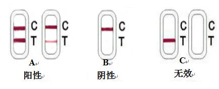 2.3 在试纸条质控线处不出现红色条带,判为无效(见图2,C)。