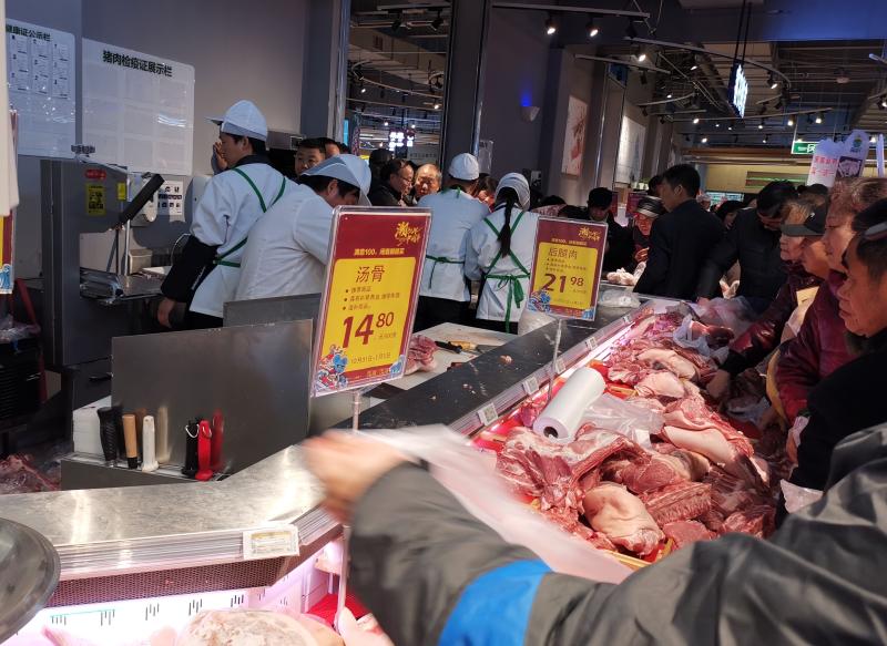 重新装修后开业的普陀真北地区“萬家MART”的猪肉柜台边也是人山人海,汤骨每500克14.8元、后腿肉21.98元、带皮前腿肉(冷冻)15.98元……标价将一直延续到本月5日。记者看到不少消费者的购物车里,排骨一买就是一整条,猪后腿也是半只半只买。这家店原先是华润万家真北店,转型升级之后,为打响“生鲜牌”,他们特意从华润集团旗下的五丰上食组织了一批猪肉开展大促销,引得周边社区居民纷纷前来团购、拼购。