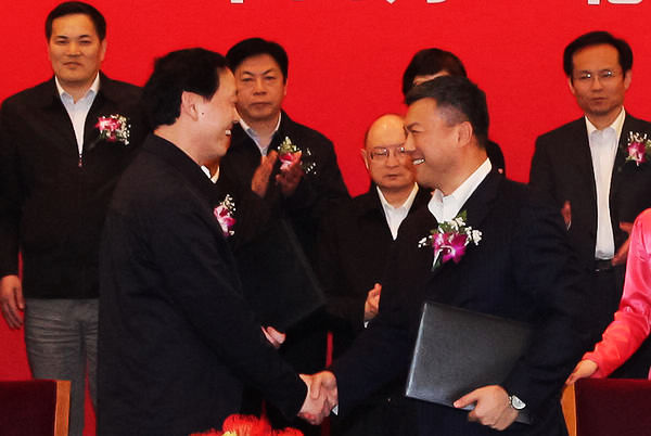 图为农业部副部长余欣荣和国家开发银行副行长袁力分别代表双方签署《共同推进现代农业发展合作协议》后热情握手。