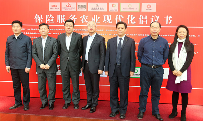 2月25日,农业部、中国保监会在京联合召开保险服务农业现代化座谈会。农业部部长韩长赋、中国保监会主席项俊波与部分保险机构、新型农业经营主体代表、地方保监及农业部门和有关专家学者进行了交流座谈,共同研究探讨下一步推动完善农业保险制度的思路和举措。中国人民财产保险股份有限公司、中华联合财产保险股份有限公司、安信农业保险股份有限公司、安华农业保险股份有限公司、阳光农业相互保险公司、国元农业保险股份有限公司和中原农业保险股份有限公司等7家保险机构在会上联合发布《保险服务农业现代化倡议书》。