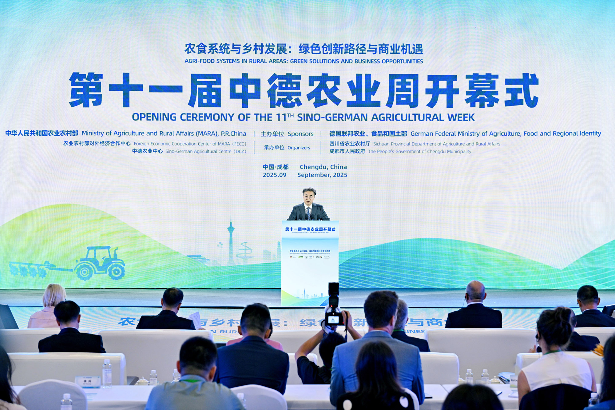 本网讯 9月4日,第十一届中德农业周在四川省成都市举办。本次活动由中国农业农村部与德国联邦农业、食品和国土部联合主办,主题为“农食系统与乡村发展:绿色创新路径与商业机遇”。农业农村部国家首席兽医师(官)陶怀颖,德国联邦农业、食品和国土部国务秘书马库斯·希克,四川省副省长胡云等嘉宾出席开幕式并致辞。