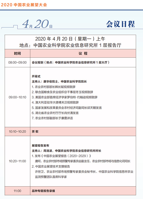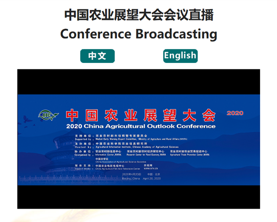 因疫情防控需要,会议采用现场直播的方式举行, 4月20日上午9:00开始直播。视频直播主要通过农视网、中国农业监测预警网进行。也可关注中国农业监测预警微信公众号观看直播。