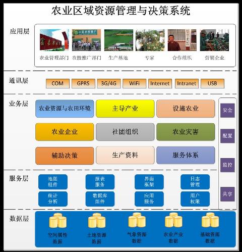 以农业信息科学为指导,以农业生产管理与服务为目标,运用信息处理技术、数据库技术、“3S”技术、多媒体技术、网络技术等农业信息技术管理农业土地资源、水资源、气象资源、生物资源、农业生产资源、社会经济和科技资源等信息,搭建一个可查询、可分析、可决策的农业区域资源管理与决策系统平台,使区域农业管理部门做到“情况清、底数明”、“决策有依据、实施有目标”,使农业生产经营主体做到“优化配置农业资源、高效管理农业生产”。