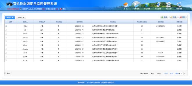 面向农机服务组织,实现订单有机管理、农机作业精确调度、农机作业实时动态监管、作业信息统计分析以及农机服务组织内部资源综合管理等业务功能,为农机服务组织信息化运营管理提供支撑。同时基于移动设备实现农机作业移动监管功能,为领导及业务人员进行及时作业监督与管理提供了方便快捷的手段。