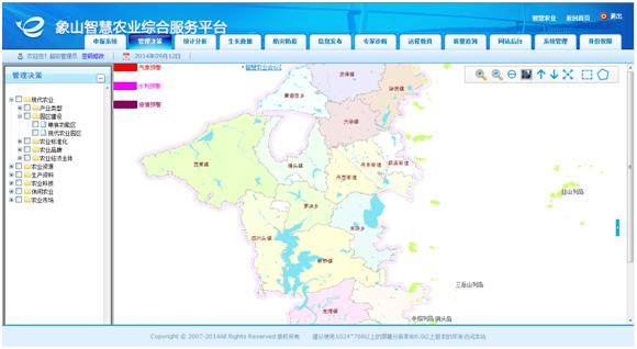 该平台在宁波象山县新型业态农业中,有效满足了政府农业行政管理部门对新型农业和智慧农业信息化的需求。现已于2014年初完成一期建设工程,预计到整个项目完成后,将打造成一个集农业精细化、参数化科技推广服务、防灾系统集成服务、动植物和水产防疫服务、质量安全检测与信息发布服务、园区集中展示服务、农业科技培训服务、农业金融服务、会计代理服务和农业生产资料供应与配送服务等多种服务于一体,利用现代信息技术手段,充分满足象山农业主体需求,直观展现项目区农业风貌,进一步推动现代农业发展的农业综合服务平台。