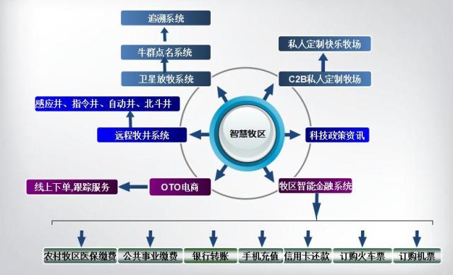 牧区智能金融系统:包括畜牧银行和远程支付。畜牧银行可实现草牧场流转、活畜贷款。远程支付是在牧区就可实现医保费、公事业缴费,银行转账,信用卡还款,订购机票、火车票,手机充值等业务。