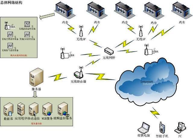 基于Wifi网络的智能环境控制系统(鸡舍)采用物联网和GSM远程数据交换技术,来实现远程对鸡场的温度、湿度、氨气、CO2、光照等数据的实时采集,并通过与已建成的专家数据模型对比来操控鸡场的有关机电设备,给鸡群提供最适宜的环境,大大减少了环境应激反应。同时,根据设定的科学防疫程序,及时发出免疫及防治预警信号,从而确保了鸡群的健康生长。