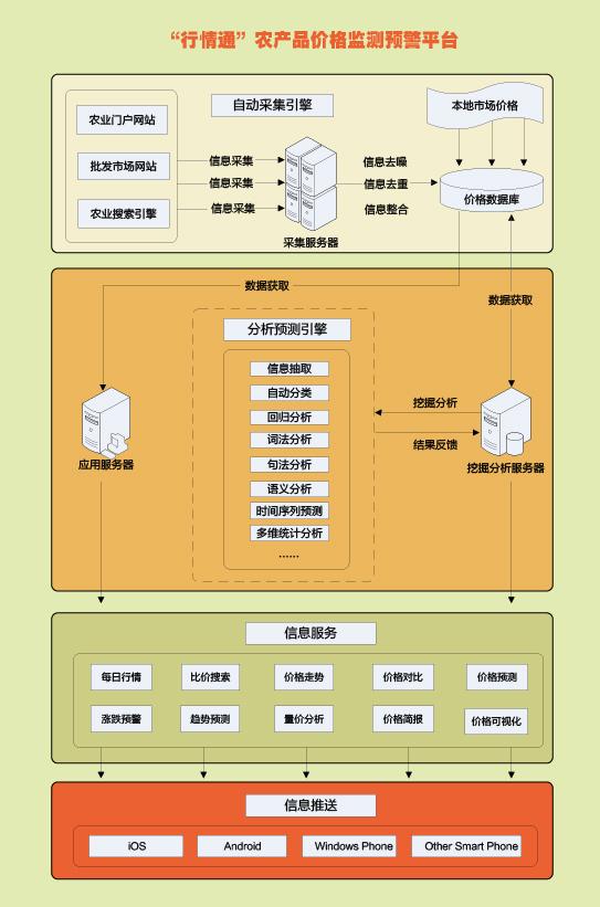 系统基于“云采集”+“智能终端上传”模式进行价格数据收集,“云采集”模式利用云计算技术从互联网涉农网站、搜索引擎及批发市场网站对全国各地的价格数据进行分布式采集,然后对数据进行统一的转换、清洗、去重、汇总和保存。“智能终端上传”模式则是利用智能手机客户端软件对本地的市场价格数据进行人工上报汇总。因此,系统可以实现本县市、本省和全国价格的统计比较分析,同时对价格的短期预测和长期趋势预测也更为精确。