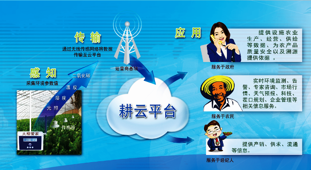 设施农业物联网由传感设备、传输设备(大棚管家)和服务管理平台(中国农业信息网物联网频道)共同组成。通过传感设备实时采集温室(大棚)内的空气温度、空气湿度、棚外温度与风速等数据;将数据通过电信运营商的无线通讯网络传送到服务管理平台(耕云)。服务管理平台结合农户种植计划、市场行情和大棚实时环境参数进行分析处理,通过网站、手机短信、WAP、客户端等方式为农户、农企、专家、政府、商贩提供综合信息服务。