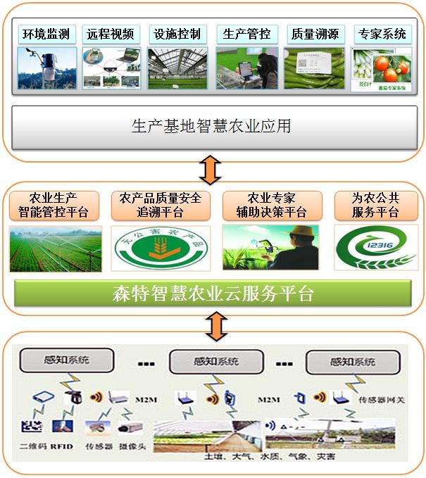 “森特智慧农业云平台”是一个集数据采集、处理、传输、储存、智能决策、过程管理、公共信息服务于一体的现代农业智能化服务平台,是连接各农业生产企业、政府部门和社会公众的重要枢纽。平台应用到设施农业、畜禽养殖、水产养殖各个领域,为农业生产管理提供实时数据采集、远程设备控制、视频实时监控、气象灾害预警、生产过程管理、专家系统应用等服务,有利于农业企业对种养殖过程的远程监管、精准生产和智慧管理,推进企业机器换人进程,推进现代农业建设。