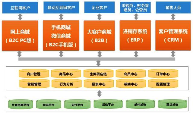 生鲜农产品电商解决方案以面向广大中小企业实现O2O解决方案所需的B2C、B2B、ERP和CRM四大平台为核心,基于互联网和移动互联网发布,实现PC端和移动客户端方式应用。生鲜农产品电商解决方案致力于实现生鲜产品标准化、电商多平台销售、供应链管理完美联动和销售客户全流程跟踪,满足了客户、企业全渠道购物、企业管理者全流程管理业务需求,解决了农产品电商IT系统的痛点和难点,帮助中小企业快速O2O布局。生鲜农产品电商解决方案实现了商户管理、商品中心、生鲜供应链管理、会议中心、订单中心、营销管理、行为分析、报表中心、帮助中心和配置管理等核心应用,对接社会电商平台(如TMALL)、物流平台(如顺丰快递)、支付公司(如易宝、支付宝)、短信平台、微信平台、邮件系统和配货系统,完成销售、采购、仓管、加工、配送等环节的电子商务IT系统一站式解决方案。
