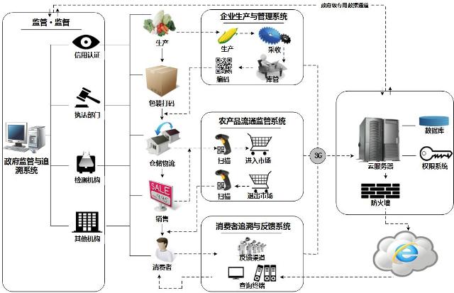 溯源系统可分成两个层面来建设,横向溯源主要实现农产品从田间经过流通到达消费者手中这一全程追溯,农产品在生产采收阶段通过溯源信息的录入并进行批次编码,然后进入产品仓储流通领域,即所谓的入市,入市以后,将相关节点数据录入农产品流通监管系统,并在原有生产信息的基础上写入流通溯源信息,经过销售到达消费者手中,退出市场,此时消费者可扫描二维码进行溯源信息的查询,也可根据使用的情况进行反馈与投诉。在纵向溯源层面,政府及检测部门通过专用数据通道与溯源云服务器进行数据对接,实现对农产品从田间到餐桌全过程每个节点进行抽检、认证与管理。