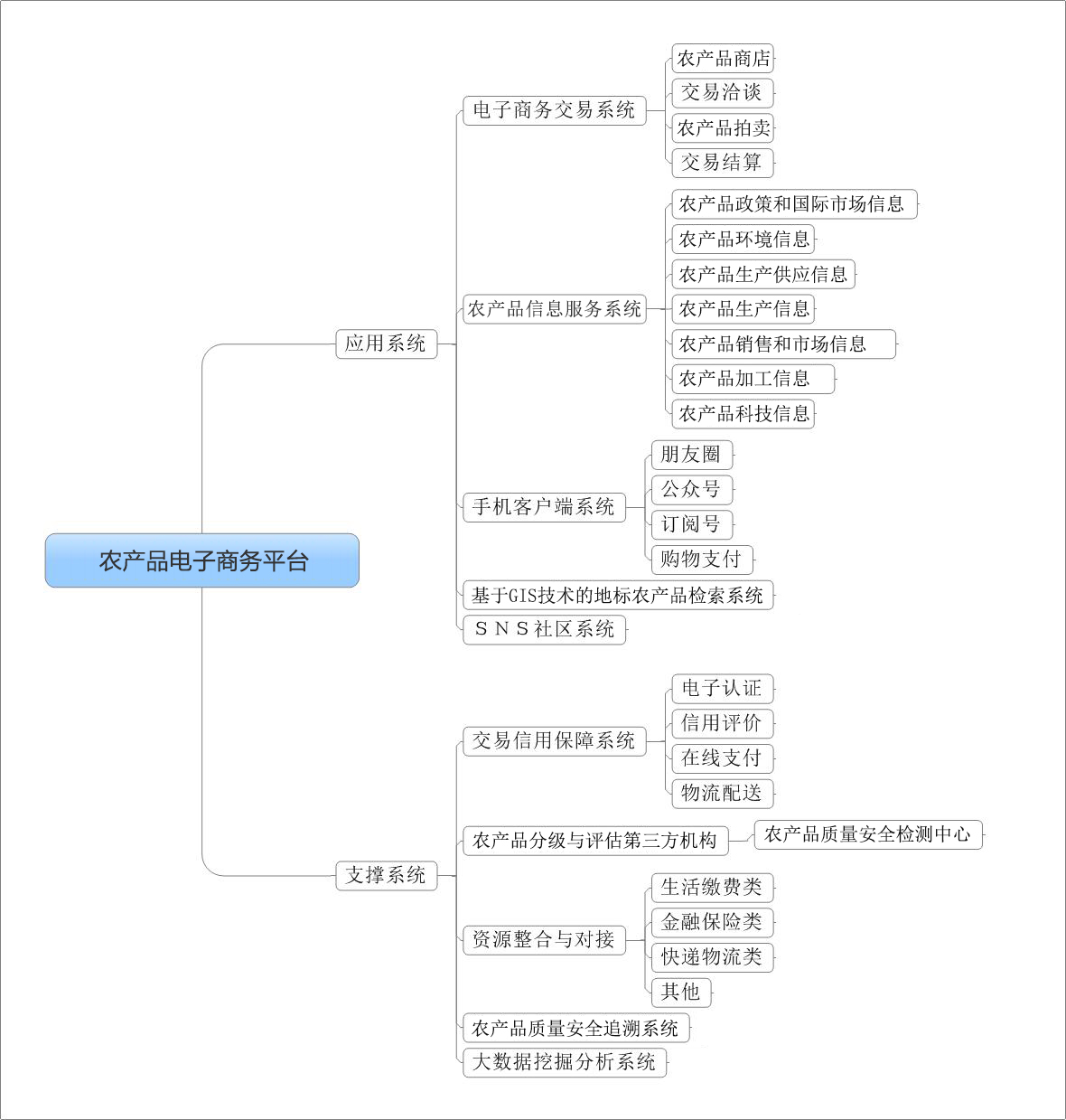 农产品电子商务平台,综合运用先进的互联网、物联网、移动互联网、云计算、大数据技术,搭建可靠、安全、可追溯、可认证的农产品供需平台。面向企业提供全面的农产品电子商务解决方案,包括资讯平台、展示平台、交易平台、商务平台、知识平台、安全迫溯与信用认证平台、数据平台、管理平台、广告平台,SNS媒体平台等十大平台。透过WEB门户、手机客户端、短彩信、语音呼叫中心、IPTV等媒介通道,全面实现农产品生产与加工企业查询、交易、营销、推广、企业管理、企业流程服务等环节信息化、智能化。