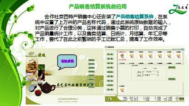 灵之秀合作社京西特产销售中心安装了产品销售结算系统,在系统中设置了上万件的产品名称代码,通过此系统原始数据的输入,对产品进行了合理分类,这样通过销售小票的打印,自动完成了产品销量统计工作,以及售卖结算、日统计、月结算、年汇总等工作,替代了在此之前繁琐的手工记账汇总,提高了工作效率。