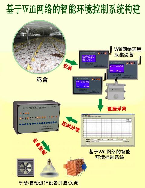 基于Wifi网络的智能环境控制系统(鸡舍)采用物联网和GSM远程数据交换技术,来实现远程对鸡场的温度、湿度、氨气、CO2、光照等数据的实时采集,并通过与已建成的专家数据模型对比来操控鸡场的有关机电设备,给鸡群提供最适宜的环境,大大减少了环境应激反应。同时,根据设定的科学防疫程序,及时发出免疫及防治预警信号,从而确保了鸡群的健康生长。