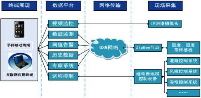 本系统是面向农业领域推出的第一代拥有自主知识产权的远程环境监测系统。它是通过光照、温度、湿度等无线传感器,对农作物温室内的温度,湿度信号以及光照、土壤温度、土壤含水量、CO2浓度、叶面湿度、露点温度等环境参数进行实时采集,自动开启或者关闭指定设备(如远程控制浇灌、开关卷帘等)。同时在温室现场布置摄像头等监控设备,实时采集视频信号。用户通过电脑或智能手机,随时随地观察现场情况、查看现场温湿度等数据和控制远程智能调节指定设备。