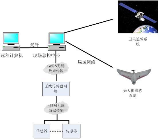 该系统以地面无线传感器网络、无人机遥感监测和卫星遥感相结合监测农作物苗情、墒情、病虫情、灾情等综合信息,以农作物调优栽培决策支持系统为平台的农业生产决策技术,从而实现农业生产监测管理从基础设施硬件到软件平台的信息化管理产业链。地面无线传感器网络利用传感技术获取地面离散点的环境信息和土壤墒情信息;无人机遥感监测技术利用无人机获取核心区域的高分辨率农田信息,并利用地面无线传感器网络获得的数据进行校准和优化,实现地块级小范围宏观层面的信息获取和分析;针对于县市级大面积的信息获取和分析,采用卫星遥感技术,并利用无人机遥感监测技术获取的核心区域农情信息进行校准和优化。