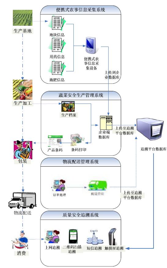 以实现高效生态农业示范园蔬菜质量安全为目标,以“标准化生产、标识化追溯”为突破口,以生产企业-超市为主要应用模式,以二维条码为载体,构建蔬菜质量安全追溯系统。通过在生产基地应用便携式农事信息采集系统,实现生产履历信息的快速采集与实时上传;通过在生产企业应用有机蔬菜安全生产管理系统,实现有机生产的产前提示、产中预警和产后检测;通过在配送中心应用农产品物流配送管理系统,实现车辆监控和物流调度,通过将供应链各环节数据汇集到园区管理部门,构建追溯平台数据库,实现上网、二维条码扫描、短信和触摸屏等方式的追溯,从而保障蔬菜的产品质量。