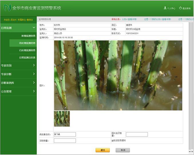 农业病虫害远程预警及诊断系统,以网络数据库为基础的多媒体专家系统知识库、专家系统推理机,以昆虫分类鉴定检索表为基础的智能化专家系统知识库构建工具和多媒体用户界面等组成。实现的原理是通过对远程视频图像的高分辨率的采集,对害虫图像进行分析、处理,获取图像的数字化特征值,建立主要农业(如:蔬菜、农作物等)害虫的数字化特征库,利用图像识别技术,进行病虫害的远程识别,并给出相应防治方案。此外,多点监测也可以对农业病虫害发生区域的整体情况进行分析及病虫害爆发预警,管理人员可及时采取相应措施,减少生产损失。