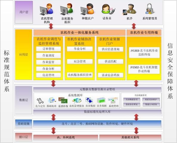 该系统以北斗(BDS)定位为基础,集成应用地理信息系统(GIS)、遥感(RS)、移动互联等技术,构建面向农机管理机构、农机服务组织和农民的农机作业一体化服务系统。同时,根据农机作业特征、农机环境特征及农机作业管理需求,设计并研制开发两款北斗农机作业专用终端。