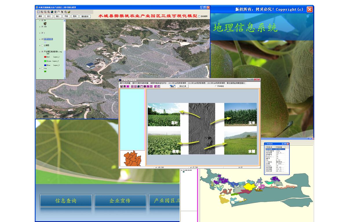 喀斯特山地农业地理信息系统研制及遥感技术在贵州省的推广解决了贵州省农业发展中遇到的主要问题,既农业信息化程度低、数据调查、查询及使用困难的等问题。系统通过分析模块,结合信息化农业资源数据,针对产地环境,对任意农作物的种植适宜区进行评价分析,从而起到为农作物种植适宜性提供科学的数据支持,对农业规划、提高农作物种植效率起到辅助决策作用;系统实现三维模拟可视化功能,客户可以利用三维模拟模块对应用区域进行全方位查看,直观地对应用区域进行全局规划,将应用区域合理地科学地进行分配管理,从而实现精准农业的管理模式,使管理人员做到足不出户便知应用区域事宜,同时利用三维模拟可视化功能便利地向政府、客户、企业进行推广及宣传,为喀斯特山地现代农业产业的管理和发展提供有利平台;