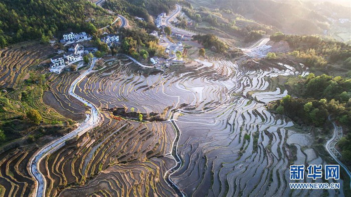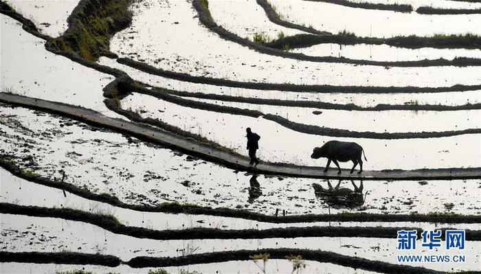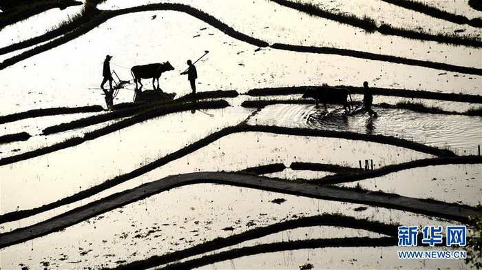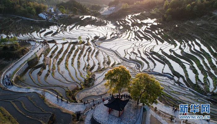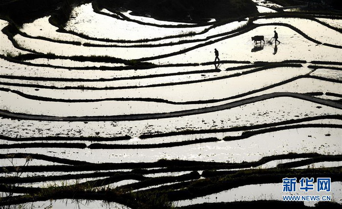 4月10日清晨,雾云山村的农民在梯田劳作。新华社记者 程敏 摄