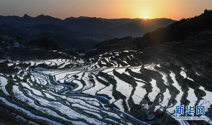 雾云山梯田的日出景观(4月10日摄)。新华社记者 程敏 摄