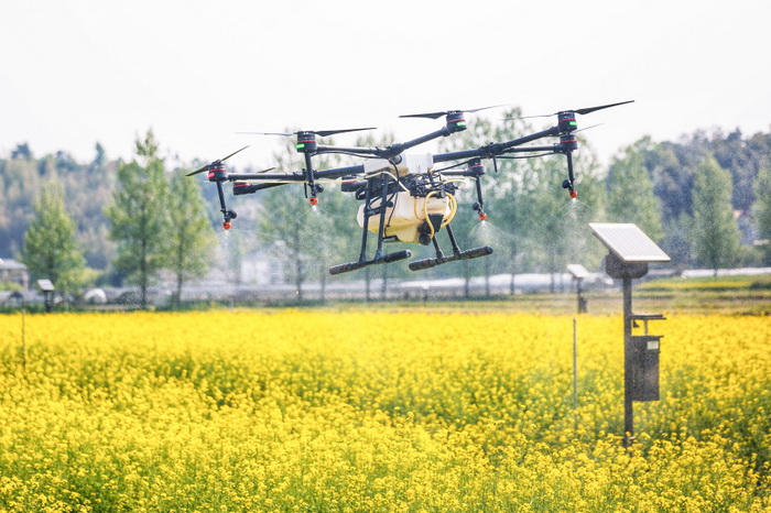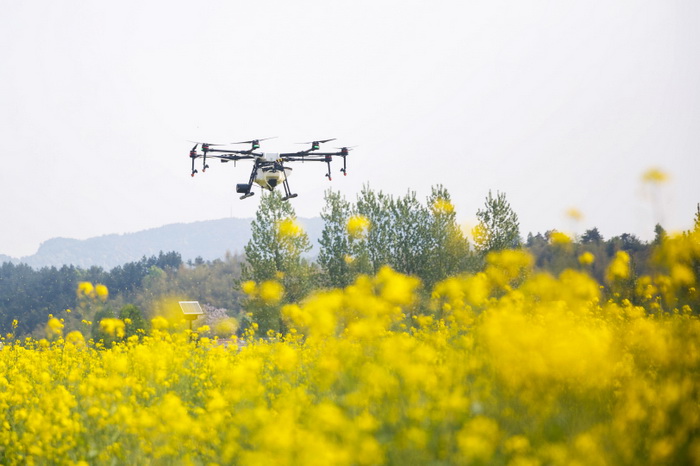 4月12日,在安吉县的一油菜园内,农技人员正在使用无人机为数百亩油菜喷洒防治油菜菌核病和蚜虫病的药物。据悉,单台无人机每小时就能完成可喷洒农田30亩左右,相当于20个人工同时作业,大大提升了作业效率。(拍友 张卉 摄)