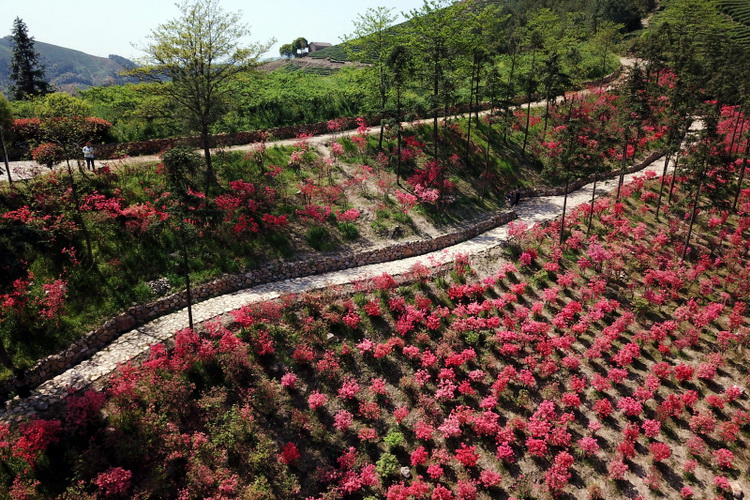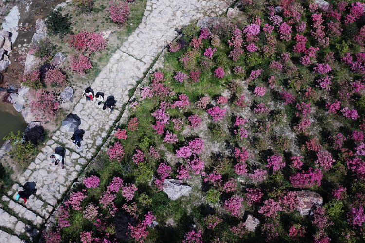 4月10日,浙江省湖州市长兴县和平镇城山沟景区内,上百亩映山红竞相开放,吸引不少游客赏花踏春。(拍友 杨晓霞 摄)