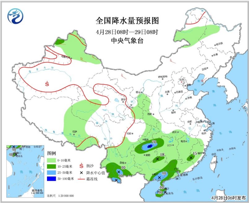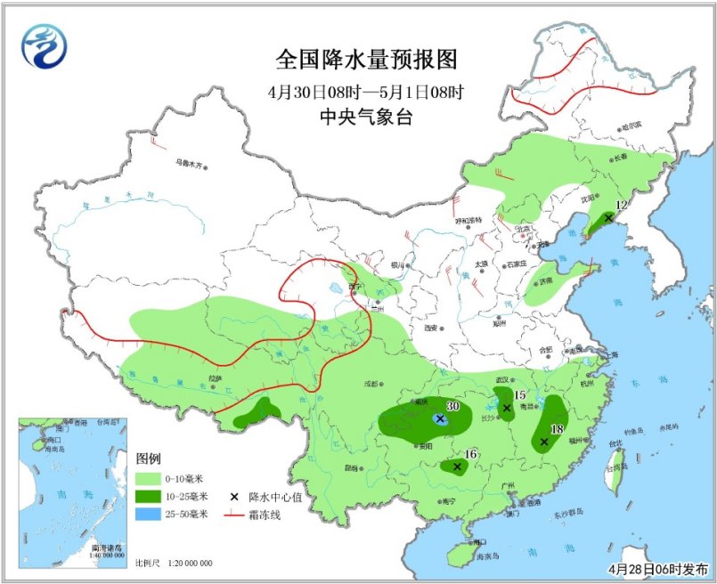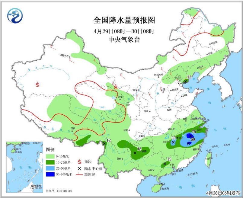 “五一”小长假期间,北方地区以多云天气为主,南方将有两次降水过程,降水范围覆盖南方大部地区,局部地区将伴有短时强降水等强对流天气。其中今夜至29日,江南、江淮南部、西南地区东部和南部等地将有一次降水过程,江南东北部、贵州等地有中到大雨,局地有暴雨;4月30日夜间起至5月2日,西南地区东部、江南、华南等地自西向东将又有一次降水天气过程。请公众及时关注预报和预警信息,做好防护措施。