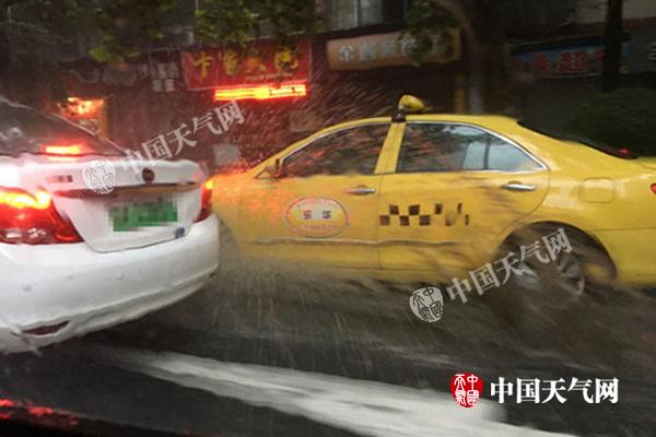昨天早晨,南京降下暴雨,两车开过时,车轮溅起很高的水花溅。(拍摄:陈睿)