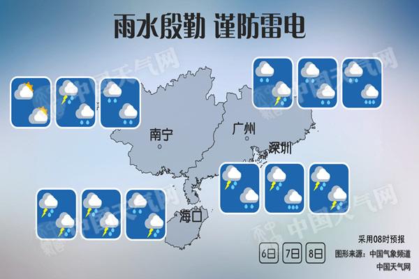 近期,南方阴雨频繁,安徽、江苏局地甚至打破5月单日最强降雨纪录。预计今天(7日),雨带将南压至华南一带,大部地区将出现大到暴雨。明起三天,广东、广西、海南等部分地区将有暴雨或大暴雨,并有强对流天气。另外,江淮、江汉、江南一带最高温有望降至25℃以下,华南将脱离30℃,闷热的现状得以改善。