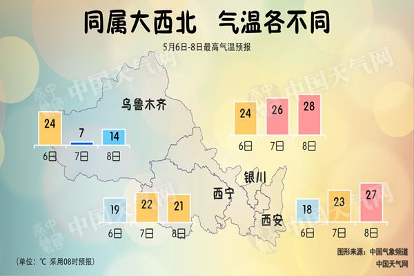 因此,今天新疆沿天山一带气温会率先出现骤跌,降幅普遍达到10-14℃,局地超过15℃。首府乌鲁木齐的最高气温将出现17℃的气温骤跌,从昨天的24℃,降到只有7℃。在新疆降温的同时,西北其余地区会先短暂升温,兰州、银川将先后达到28℃,西宁也会回到20℃以上。预计在9-10日,西北地区大部同样也会遭遇气温的剧烈下滑。