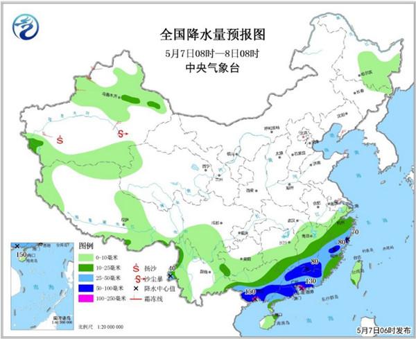 今天长江中下游一带雨势减弱甚至停歇,强降雨南压至华南一带,广东、海南、广西等地有大到暴雨,而且大多以短时强降雨、雷暴大风这样的强对流形式出现。中央气象台预计,5月7日08时至8日08时,浙江南部、福建北部和西部、江西南部、湖南东南部、广西南部、广东大部等地的部分地区有大雨,其中,浙江东南部、福建东北部和西南部、江西南部、广东北部和南部、广西南部等地有暴雨,局地大暴雨(100~150毫米);上述局部地区将伴有短时强降水等强对流天气。