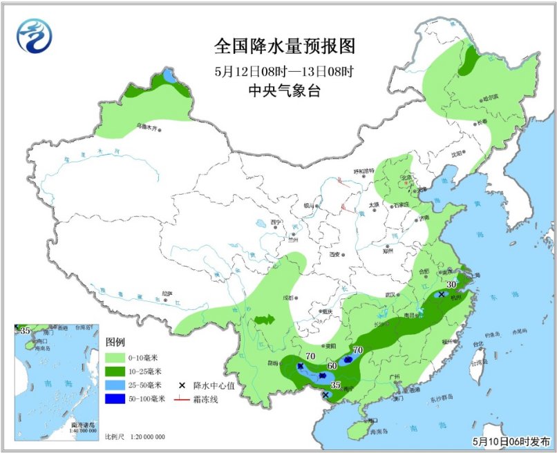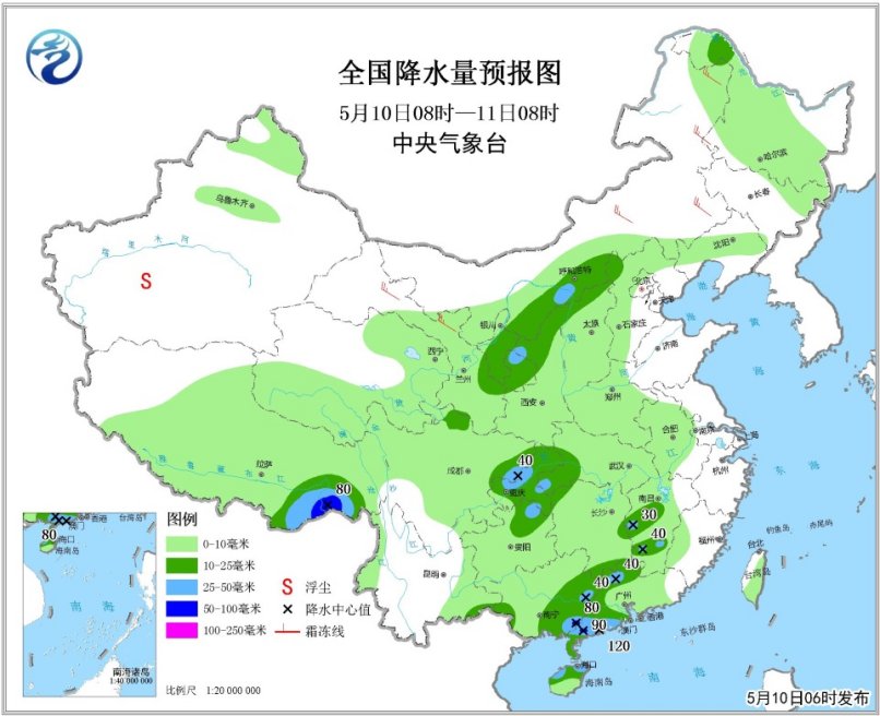 5月10日08时至11日08时,华南沿海仍有分散性大到暴雨。西北地区东部、西藏东南部、四川盆地东部、江南中部、华南南部等地有中到大雨,其中,广西东南部、广东西南沿海等地的部分地区有分散性暴雨或大暴雨(100~120毫米),上述局部地区将伴有雷暴大风、短时强降水等强对流天气。甘肃中部、内蒙古中东部等地有4~6级风。