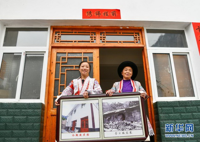 2月20日,在贵州省毕节市黔西县新仁苗族乡化屋村麻窝寨易地扶贫搬迁集中安置点,苗族女孩王代玉(左)与母亲杨文梅在自家新房前展示易地扶贫搬迁前后的对比照片。近年来,化屋村在实施易地扶贫搬迁的同时,大力发展特色种植、养殖、旅游等产业,村里迎来跨越式发展。 新华社记者 杨文斌 摄